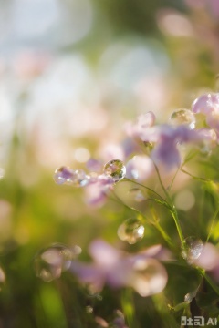 Lighting art, macro photography, vibrant flowers, 1 dewdrop, focus dewdrop, selective focus, bokeh, morning, edge light, surreal, movie, meadow, contemporary art, close-up, soft light, warm light, enhanced details, leca camera, shiny, high quality, masterpiece, (no one)