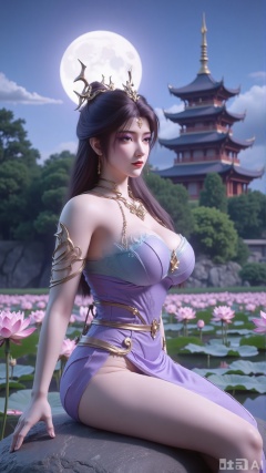 (masterpiece,best quality:1.23),a woman with long, wavy hair is seated on a large gray rock. She is dressed in a dress with a belt around her waist. Her dress is adorned with a flower in her hair, adding a touch of beauty to the scene. In the background, a pagoda-like structure stands out against a backdrop of trees and a moon.(huge breasts, full breasts:2.99),(Background with lotus pond and pink lotus flowers:1.39),,Xbigbreasts,XmengkeerHH,XwensiyueXYH,Xmengkeerheihua,XwensiyueYH,Xhongfenkulou