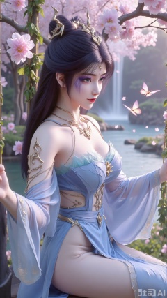 (masterpiece, best quality:1.2),In a cinematic shot with soft sunlight filtering through petals, a delicate fairy-like beauty swings gently on a flower swing amidst a whimsical garden. She wears a pale blue hanfu with flowing wide sleeves and a translucent silk sash tied around her slender figure. Her long black hair with blue highlights cascades down her back, adorned with a pearl hairpin. A gentle smile plays on her innocent eyes as she floats above the flowers, surrounded by fluttering butterflies and golden pollen particles. Magical runes float in the air, casting an ethereal glow. Vines wrap around the ropes of the swing, intertwined with roses and morning glories. The pastel color palette and fantasy atmosphere evoke a sense of wonder and enchantment.,(huge breasts:2.99),(full breasts:2.99),,Xbigbreasts,XmengkeerHH,XwensiyueXYH,Xmengkeerheihua,XwensiyueYH,Xhongfenkulou