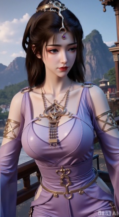 (masterpiece, best quality:1.2),1 girl, solo, long hair, black hair, hair accessories, clothing, cleavage cuts, long dress, jewelry, upper body, earrings. Background is outdoor, sky, clouds, water, trees, architecture, landscape, lantern, mountain, dragon, architecture, bridge, east Asian architecture, fog, pagoda,,(huge breasts:2.99),(full breasts:2.99),XXbaifengsongyuYH,Xbigbreasts,Xmengkeerheihua,XwensiyueYH,XwensiyueXYH,XmengkeerHH