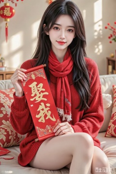 1 个女孩,美女,五官精致秀丽甜美,黑色长发,穿红色毛衣,全身,坐在沙发上,红色围巾,新年喜庆氛围,手拿一个新年快乐的红色横幅上用毛笔写着“娶我”两个金色大字,正面照,微笑,丁达尔光影,细节描写细致,精美,写实摄影,32K,大师级构图,