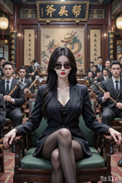 一个女孩,女老大,御姐,年轻,非常美,,霸气,中国女性,容颜俊美,冷白皮,嚣张时尚黑色长发,五官精致立体,高鼻梁,,戴墨镜,西装,全身照,坐于青龙堂上首座位,周围是一众西装小弟每个人手执一把斧头,在大堂内,旧上海风格。背景是一幅字画,高处的横幅牌匾写着“斧头帮”三个大字