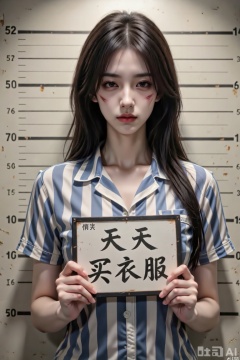 主体特征:图中肥美丽女孩双眼微眯眼神桀骜,嘴巴紧闭表情严肃,全身伤痕累累,捧着一块标牌。