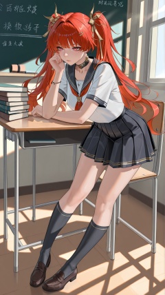 masterpiece,best quality,amazing quality,<lora:augusta-000025:0.8>,1girl,red eyes,red hair,augusta \(wuthering waves\),<lora:20250808-1754650692631:0.8>,zhigan3d,school_uniform,sailor_collar,pleated_skirt,ribbon_tie,kneehigh_socks,loafers,blunt_bangs,twin_tails,classroom_background,chalkboard,desk_stack,sunlight_window,