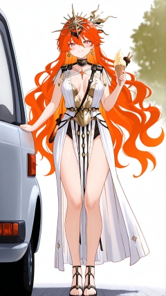 masterpiece,best quality,amazing quality,<lora:qban1:1>,qban1,<lora:augusta-000025:0.8>,bronze_headdress,gear_center,flame_like_spikes,black_ribbon,religious_headdress,ornate_headpiece,metal_crown,augusta \(wuthering waves\),1girl,red eyes,food,solo,long hair,holding,ice cream,earrings,jewelry,red hair,smile,looking at viewer,holding food,orange hair,dress,ice cream cone,full body,white dress,motor vehicle,closed mouth,holding ice cream,very long hair,hair between eyes,standing,sandals,breasts,1girl,solo,white background,simple background,looking at viewer,blush,blush stickers,