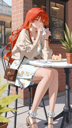 masterpiece,best quality,amazing quality,<lora:augusta-000025:0.8>,1girl,red eyes,red hair,augusta \(wuthering waves\),<lora:20250808-1754650692631:0.8>,zhigan3d,1girl,solo,floral_dress,short_sleeve_dress,ruffled_hem,white_knit_cardigan,cropped_cardigan,mary_jane_shoes,ankle_socks,small_leather_tote,holding_latte,sitting_at_outdoor_table,street_cafe,brick_wall (cafe exterior),potted_plant,small_cake_on_plate,napkin,afternoon,warm_sunshine,passersby (blurred background),shallow_depth_of_field,cozy_atmosphere,