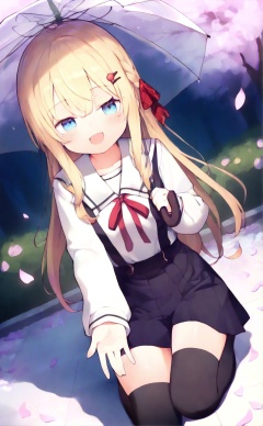 masterpiece,very aware,highres,absurdres,newest,best quality,loli,petite,high quality,chromatic_aberration,cinematic_angle,dutch angle,blurry_foreground,A light gradient background with white on top and brown at the bottom,student,"Girl",//,1girl,solo,thighhighs,long hair,skirt,hair ornament,umbrella,school uniform,garter straps,holding,braid,cherry blossoms,blue eyes,blonde hair,open mouth,long sleeves,sailor collar,smile,shirt,white shirt,holding umbrella,flower,ribbon,serafuku,fang,black thighhighs,hairclip,blush,looking at viewer,red ribbon,bangs,black skirt,neck ribbon,petals,pleated skirt,collarbone,outdoors,transparent,suspenders,breasts,suspender skirt,outstretched arm,//,//,blurry background,blurry background,official art,depth of field,detailed light,best shadow,shiny skin,cinematic lighting,ray tracing,amazing quality,very aesthetic,absurdres,beast quality,ultra detailed,newest,8K,HDR,full_shot,//,<lora:lora-000003.by_tusi:1.5>,