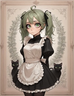 1girl,solo,breasts,looking at viewer,bangs,long sleeves,dress,bow,ribbon,twintails,closed mouth,green eyes,hair ribbon,flower,ahoge,pantyhose,cowboy shot,frills,green hair,puffy sleeves,apron,black dress,black pantyhose,maid,black ribbon,black bow,arms behind back,cat,frilled dress,juliet sleeves,white apron,:<,floral background,black cat,