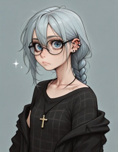 shirt,cross,solo,braid,jewelry,necklace,plaid shirt,cross necklace,blue background,1girl,black shirt,long hair,glasses,ear piercing,piercing,jacket,plaid,upper body,closed mouth,looking at viewer,simple background,sparkle,expressionless,jacket partially removed,blue eyes,single braid,blue hair,earrings,black jacket,hair between eyes,off shoulder,collarbone,round eyewear,light blue background,long sleeves,black-framed eyewear,open clothes,latin cross,frown,