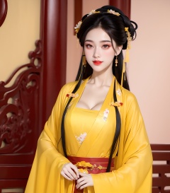 1girl,jewelry,red_lips_,water red lips,drop earrings,eye makeup,black hair,(solo:1.1),full breasts,hanfu,<lora:汉服齐腰吊带1.3:0.8>,dress,chest,cleavage,upper body,long hair,(yellow hanfu:1.3),(yellow_dress:1.3),