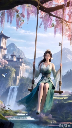 (masterpiece, top quality, best quality, official art, beautiful and aesthetic:1.2),Dynamic posture,(Sitting on the swing:1.39),natural skin texture,(Milky skin:1.2),1gir,solo,long Dress, (Long legs, perfect proportions:1.2),(Sakura, butterfly:1.29),(huge breasts:2.99),(full breasts:2.99),Wisteria, wisteria flowers, castle, waterfall, mountains in the distance,XsongyuQwen,XyinyueQwen,XlujiajiaQw,XsongyuQwen,XmupeulingQwen,XiPhone17Pro
