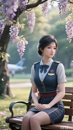 (masterpiece,best quality:1.23),portrait of a stewardess, beautiful face, perfect hourglass figure, China Southern Airlines uniform, sitting on a park bench, wisteria vines, blooming flowers, soft focus, out-of-focus background,(huge breasts, full breasts:2.99),XlujiajiaQw,XmupeulingQwen,XsongyuQwen,XyinyueQwen,XsongyuQwen,XmupeulingHY3