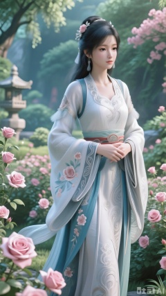 (masterpiece:1.2),best quality,,A woman adorned in traditional Chinese attire,featuring a flowing robe with intricate embroidery and floral accents. A garden filled with pink roses and lush greenery. Soft pastel hues of white,blue,and green,creating a serene atmosphere. Photorealistic photography.,(huge breasts:2.99),(full breasts:2.99),XlujiajiaQw,XmupeulingQwen,XsongyuQwen,XyinyueQwen,XsongyuQwen,XmupeulingHY3