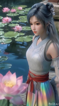 (masterpiece, best quality:1.2),1girl, navel, solo, midriff, bare shoulders, hair ornament,(long hair),(High double ponytail:1.49), red lips, BREAK, (looking at viewer:1.39), chinese clothes,(Holographic long dress:1.36), (lace,Rainbow Gradient Color:1.28), BREAK,blurry, solo focus, long hair, lips, daytime, lipstick, outdoors, standing,upper body,(huge breasts:2.89), background, solo, makeup,(Liquid glass style flowers:1.49),(huge breasts:2.99),(full breasts:2.99),,(Background with lotus pond and pink lotus flowers:1.39),XlujiajiaQw,XmupeulingQwen,XsongyuQwen,XyinyueQwen,XsongyuQwen,XmupeulingHY3