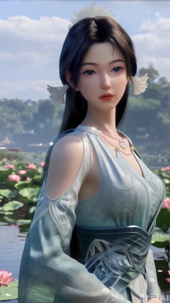 (masterpiece, best quality:1.2),1girl, navel, solo, midriff, bare shoulders, hair ornament,(long hair),(High double ponytail:1.49), red lips, BREAK, (looking at viewer:1.39), chinese clothes,(Holographic long dress:1.36), (lace,Rainbow Gradient Color:1.28), BREAK,blurry, solo focus, long hair, lips, daytime, lipstick, outdoors, standing,upper body,(huge breasts:2.89), background, solo, makeup,(Liquid glass style flowers:1.49),(huge breasts:2.99),(full breasts:2.99),,(Background with lotus pond and pink lotus flowers:1.39),XlujiajiaQw,XmupeulingQwen,XsongyuQwen,XyinyueQwen,XsongyuQwen,XmupeulingHY3