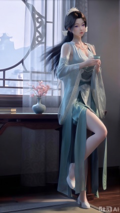 (masterpiece:1.2),Ultra clear, 8k, 1girl, solo, long hair, looking at viewer, bangs,long dress,, bare shoulders, jewelry, black hair, standing, purple eyes, full body, flower, thighs, indoors, hair bun, long dress, high heels, cup, see-through, book, bare legs, window, table, white footwear, standing on one leg, curtains, pink flower, side slit, vase, ,(huge breasts:2.99),(full breasts:2.99),,XlujiajiaQw,XmupeulingQwen,XsongyuQwen,XyinyueQwen,XsongyuQwen,XmupeulingHY3