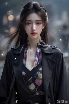 人物、上半身、看着镜头、背景虚化、发丝飘动、光泽、面容宁静美丽、伤感、神秘光芒、细腻皮肤、简约优雅服装、花色围脖、黑色风衣、柔软质地、灰调氛围、宁静神秘梦幻。8K,ziling
