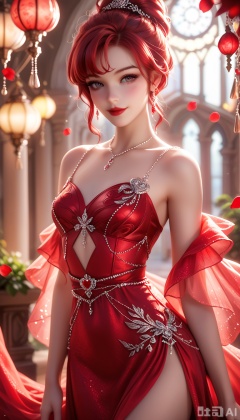 score_9_up, score_8_up, score_7_up, Cowboy Shot, girl, cute, seductive, innocent, light smile:0.3, plump lips, slender body, fit glittered red dress, red hair, silver eyes, red lipstick, red eye shadow, blush, sexy, pure innocence, whore vibe, in love, seductive gaze, red:1.1, romantic setting, dreamy pastel palette, whimsical details, colorful, softcore, warm lighting, cosy atmosphere, red theme, red and black:0.85, dim colors, 4n1v3rs3, depth of field, dynamic angle, fashion photography, sharp, hyperdetailed:1.15