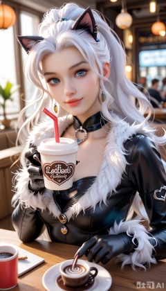 score_9_up, score_8_up, score_7_up, Portrait, Felicia Hardy, cute, seductive, innocent, light smile:0.3, plump lips, slender body, long luminous neon white hair, wavy hair, in high detailed Black Cat suit, tight black suit with white accents, gloves of her costume form retractable claws at the fingertips, sipping a cup of coffee, 4n1v3rs3, depth of field, dynamic angle, fashion photography, sharp, hyperdetailed:1.15