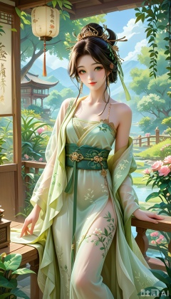 score_9, score_8_up, score_7_up,a female dressed in a traditional Hanfu, She wears a light-colored, flowing robe with intricate embroidery and a green belt, The robe has a sheer overlay, and she has a white floral accessory in her hair, The background features a serene garden setting with a wooden structure, possibly a gazebo or a bridge, and lush greenery,best hand,pretty eyes,