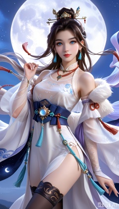 (score_9:1.1),1girl,solo,(upper_body:1.2),looking at viewer,(moon:1.1),(night:1.1),sky,night sky,(full moon:1.1),(huge planetary background:1.1),moonlight,solo,1girl,long_hair,hair_ornament,dress,jewelry,bare_shoulders,brown_hair,earrings,realistic,white_dress,detached_sleeves,black_hair,blue_eyes,tassel,chinese_clothes,fur_trim,see-through,boots,high_heels,tassel_earrings,necklace,white_footwear,black_footwear,thighhighs,fingernails,fingers,