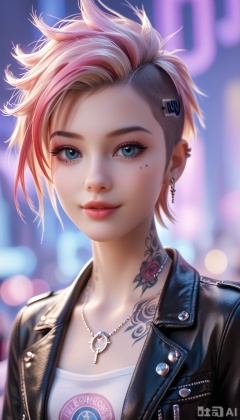 score_9_up,score_8_up,score_7_up,Portrait,girl,punk,cute,seductive,innocent,light smile:0.3,plump lips,slender body,very short hair,multicolored hair,in high detailed textured black leather jacket,piercing,small tattoo,most iconic photo,London night background,4n1v3rs3,depth of field,dynamic angle,fashion photography,sharp,hyperdetailed:1.15,
