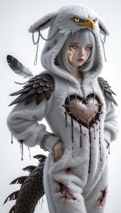 Masterpiece, best quality, ultra-detailed, sharp focus, **kigu_craft, drgn_stly, stigma_art**, 1girl, **incredibly soft,**`plush`**grayish-white short hair, sparsely adorned with several cute but broken eagle feather decorations with tiny iron chains**. She has **one eye like imprisoned lightning, golden and cracked, while the other is a pure, sky-grayish-white eye (heterochromia)**. **She wears an incredibly soft, warm, and**`ultra-fluffy`**giant grayish-white eagle-themed kigurumi (animal onesie), the hood adorned with**`plush`**cute eagle claws, and a "heart" patch crudely stitched onto the chest, with dried bloodstains (color suggestion) around the patch**. Most unsettlingly, **a bizarre "fake dragon tail" made of incredibly soft,**`plush`**dark brown faux dragon scale fabric, with several tattered eagle feathers at its tip, extends from the seat of her kigurumi. At its root, where it connects to her body, several tiny black "threads" resembling dried sinews are permeating from beneath the kigurumi's fabric, seemingly deeply embedded in her skin, secreting transparent, viscous liquid, creating a bizarre contrast with the**`fluffy`**cute exterior**. She is **standing half-length**, **her arms bound behind her back, her eyes filled with the agony of confinement and a desperate longing to fly