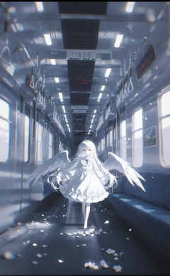 miracle, 1girl, halo, white hair, train interior, dress, red eyes, angel, wings, white dress, angel wings, letterboxed, white skin, long hair, chromatic aberration, solo, train, looking at viewer, feathered wings, wide shot, albino, blurry, pale skin, white wings, colored skin, frilled dress, floating, long sleeves, dark halo, triangle, window, vanishing point, hallway, frills, white theme, depth of field, flower, hair between eyes, scenery, train station, black border, closed mouth, black halo, expressionless, indoors, barefoot, blurry foreground, petals, standing, full body<lora:konya666up-000025:0.8>