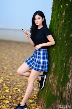 最佳质量,杰作,a woman with long black hair, dressed in a black t-shirt and a blue and white plaid skirt, is leaning against a tree trunk. She is holding a white cell phone in her right hand, her left hand resting on her hip. The woman's right leg is bent at the knee, while her left leg is resting on the trunk of the tree. The tree trunk is covered in moss, adding a touch of greenery to the scene. The leaves on the ground are a mix of yellow and brown, and the sky is a pale blue.
