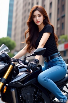 最佳质量,杰作,a woman with long brown hair, dressed in a black t-shirt and blue jeans, is seated on a black motorcycle. She is wearing a black glove on her right hand and her left hand is resting on the handlebars of the motorcycle. The motorcycle is parked on a city street, with a tall building in the background.