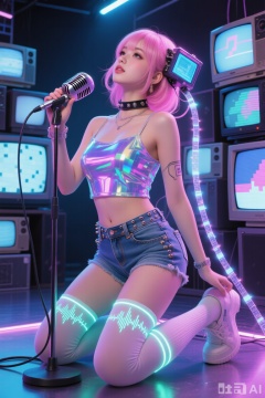 最佳质量,杰作,A holographic stage with a midground shot,where the virtual idol wears a 2000s retro crop top **** of programmable liquid crystal fabric that changes Y2K pixel patterns to the rhythm of the music. She kneels on one knee holding an old-fashioned microphone,while the microphone cable turns into a data stream connecting to an interface at the back of her head. The rivets on her denim hot pants are actually tiny speakers. LED strips on her knee-high socks form volume waveform graphics,and the choker around her neck converts fan comments into skin-electric-stimulation signals. In the background,there is a wall of CRT monitors with glitch art effects. When she tilts her chin up,a 3D scanner hidden among her pink wig captures the subtle facial expressions of the entire audience.,