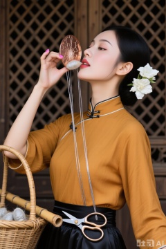 最佳质量,杰作,Close-up shot of a sericultural worker's hand, showcasing intricate details. The woman wears a safflower-dyed robe with black silk pants, adorned with a 1.2cm high collar made from seven layers of fabric. Her lips, pressed against the head rope, create an unusual reflection with the copper mirror crack patterns. Three silver threads are drawn out by her left pinky finger, still holding onto the silkworm cocoon residue. The wicker handle of the waist-mounted scissors, textured to resemble bamboo, aligns parallel to the background trellis door's lattice pattern. A small bunch of white flowers behind her ear each features delicate creases and folds, as if infusing with silken humidity from the adjacent worm silk chambers.