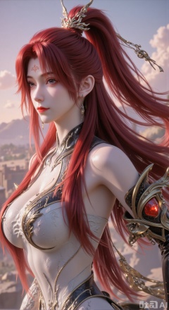(masterpiece, best quality, official art, ultra-detailed, 8k wallpaper:1.3), 1 beautiful and fierce woman, full body shot, (vibrant long red hair in a high ponytail:1.3), hair flowing in the wind, intricate golden headpiece on forehead, determined gaze looking into the distance, silver-gray form-fi
