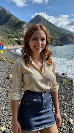An ***** woman, {A professional abstract closeup photo of a latina woman, with Copper hair and a Twirled Ends hairstyle, , , happy and smiling, wearing Knee-length denim skirt with a tucked-in blouse. after insertion, toy job., island mountain top with ocean view and fluttering prayer flags, detailed background