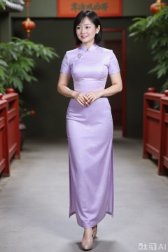 qipao, high heel, light purple qipao, fullbody,foot focus, pearl,