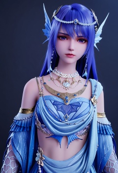 (upper_body:1.1),(looking at viewer:1.1),facing viewer,direct gaze,<lora:YQ_pony_shengcaier_fuzhuang5_V4:0.8>,q1528437228,1girl,solo,blue hair,jewelry,long hair,necklace,hair ornament,blue eyes,earrings,fins,head fins,dress,purple eyes,detached sleeves,blue dress,midriff,purple hair,beads,pearl necklace,skirt,bracelet,BREAK (white skin:1.1),(fair skin:1.1),(Ivory skin:1.1),(shiny skin),perfect anatomy,(simple background,pure black background,black background:1.1),