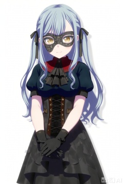 looking at viewer,togawa sakiko,bangs,ribbon,hair ribbon,black ribbon,two side up,blue hair,grey hair,sidelocks,blunt bangs,yellow eyes,black_mask