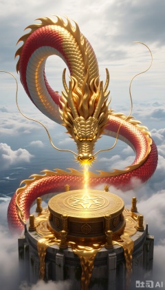 Masterpiece, best quality, ultra-high resolution, 8k, photorealistic, CG render, Unreal Engine 5, drgn_stly. Upon a gilded altar, weathered by time and situated high above a sea of clouds, a colossal and slender five-clawed golden divine dragon, its immensely long, serpentine body acting as a living barrier, majestically coils around the altar. Its colossal head hangs down directly over the altar's center, partially obscuring a glowing rune. The dragon's scales are not pure gold, but a biological keratin with a living metallic sheen, displaying a natural gradient from pale gold to rich red-gold. The center of each scale possesses an internal luminescence brighter than the sun, and ancient sacrificial totems are intricately carved upon them. Its long whiskers are like golden threads of energy. The distant sea of clouds churns behind it, and ancient, liquid-gold-like patterns flow across the altar's surface.