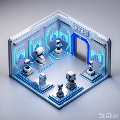展厅展台,一个科技感十足的展厅,里面陈列这几台机器人,门头文字"融雨科技",广角,俯视感