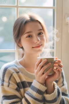 eluosi,一位清新自然的邻家女孩,上半身特写,正靠在窗边。她未施粉黛,素颜出镜,皮肤白皙通透,带着淡淡的雀斑,笑容羞涩而温柔。她穿着一件宽松的条纹针织衫,双手捧着一个冒着热气的马克杯。清晨柔和的阳光从窗户斜射进来,在她的头发和睫毛上形成轮廓光,画面温馨又安静。