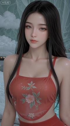 1girl, solo,red see-through round dudou, exquisite skin, upper_body, looking at viewer, even illumination, very awa, Solid Glossy and cloud background