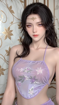 1girl, solo, Purple see-through round dudou, exquisite skin, upper_body, looking at viewer, even illumination, very awa, Solid Glossy and cloud background,