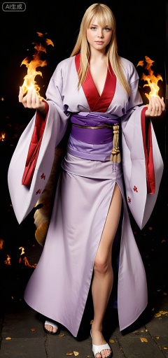 masterpiece, best quality, amazing quality, 1girl, fire swirling around hands, dark background, fantasy robes, dramatic lighting, semi-realistic style, powerful stance, balanced frame, clear focus,hyper detailed, (dynamic pose:1.4),inarimge, kitsune,kitsune, fox girl, fox ears, fox tail, multiple tails, yellow tail inarimge, blonde hair, straight hair, long hair, blunt bangs, yellow eyes, orange eyes, large breasts,