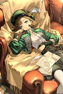 Reverse:1999, 1girl, solo, couch, green eyes, white shirt, shirt, holding, brown hair, lying, hat, on back, holding pen, on couch, white pantyhose, green headwear, short hair, quill, hat feather, paper, long sleeves, pen, pantyhose, jacket, feathers, skirt, closed mouth