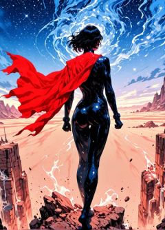 masterpiece, best quality, amazing quality,expressive, ,SuperWoman,Superwoman-LoisLane, 1girl, solo, short_hair, black_hair, standing, full_body, ass, sky, from_behind, cape, bodysuit, wind, star_\(sky\), clenched_hands, rock, red_cape, facing_away, superhero, floating_cape(dynamic pose,dynamic angle:1.2) <lora:Purple_Grace_v2:0.8> <lora:Purple_Sketchbook:0.39> <lora:LORA-64-dmd2:1>
