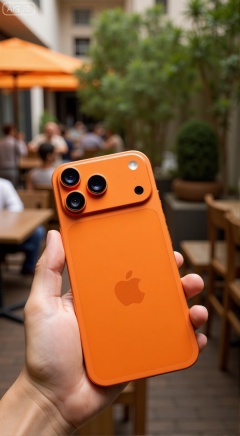 (masterpiece, best quality:1.2),A lifestyle shot of iPhone17Pro, Hermès Orange color, held in a hand, showing the back and the prominent triple camera system. The background is a blurred, sun-drenched café patio with green plants and people. Soft ambient light, a professional product photograph with bokeh effect.,XXbaifengsongyuYH,Xbigbreasts,Xiphone17proseries,Xiphone17air,Xiphone17proseries,Xiphone17air