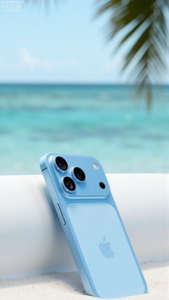 A product image of iPhone17Pro, Tiffany Blue color, lying on a white sandy beach with crystal clear water in the background. The triple camera and aluminum alloy frame are the main focus. The ocean and palm trees are beautifully blurred in a soft focus style. Large aperture..Xbigbreasts,XbaifengsongyuYH,Xiphone17air,Xiphone17proseries,Xiphone17proseries,Xiphone17air