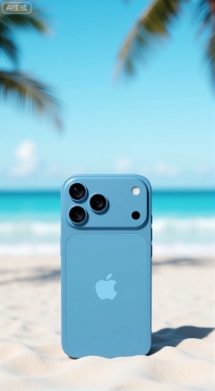 (masterpiece, best quality:1.2),,A product image of iPhone17Pro,iPhone17Pro, Tiffany Blue color, lying on a white sandy beach with crystal clear water in the background. The triple camera and aluminum alloy frame are the main focus. The ocean and palm trees are beautifully blurred in a soft focus style. Large aperture.,XXbaifengsongyuYH,Xbigbreasts,Xiphone17proseries,Xiphone17air,Xiphone17proseries,Xiphone17air