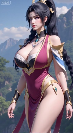 (masterpiece, best quality:1.2),(Knees), bare legs, diamond necklace, braids, full body,, 1girl, solo, long hair, breasts, looking at viewer, black hair, hair ornament,dress, , bare shoulders, jewelry, purple eyes, ponytail, braid, mountain,,(huge breasts:2.99),(full breasts:2.99),,XbaifengsongyuYH,Xbigbreasts,XliancangH,XzhouzimoH