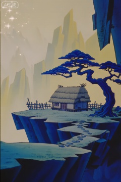 这是国产经典动画《葫芦兄弟》中的场景,画面里,悬崖边缘坐落着一间茅草屋,屋顶铺着茅草,屋旁竖着木栅栏,一条石板小径蜿蜒而出。一棵造型苍劲的蓝色松树生长于此,枝丫舒展。远处群山在淡黄色的雾气笼罩下,若隐若现,左上角还有闪耀的光点,整个场景充满神秘的东方韵味,以剪纸动画的独特风格,展现出宁静又奇幻的氛围。